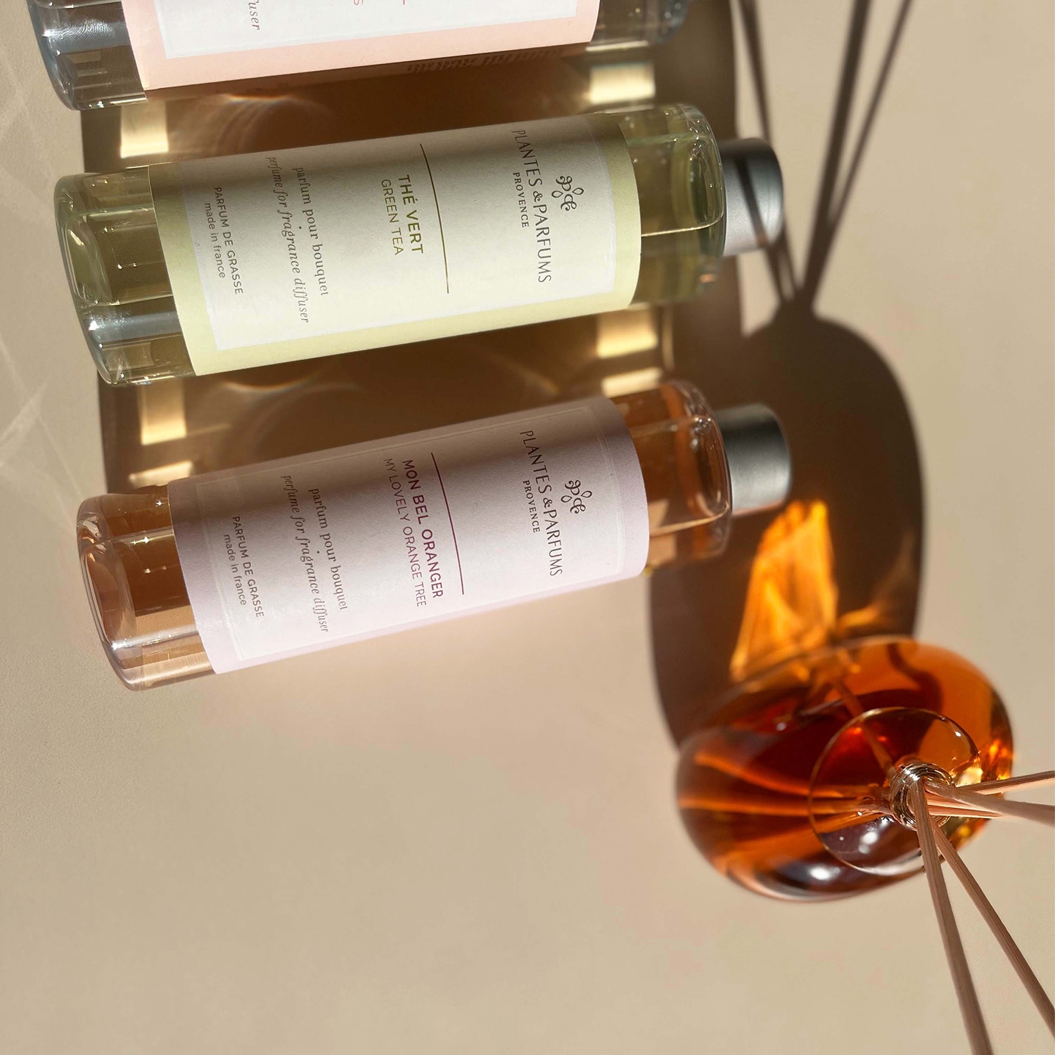 Für den Duft des Raumparfüms finden hochwertige Parfümöle aus Grasse Verwendung, die weltweit für ihre außergewöhnliche Qualität bekannt sind.