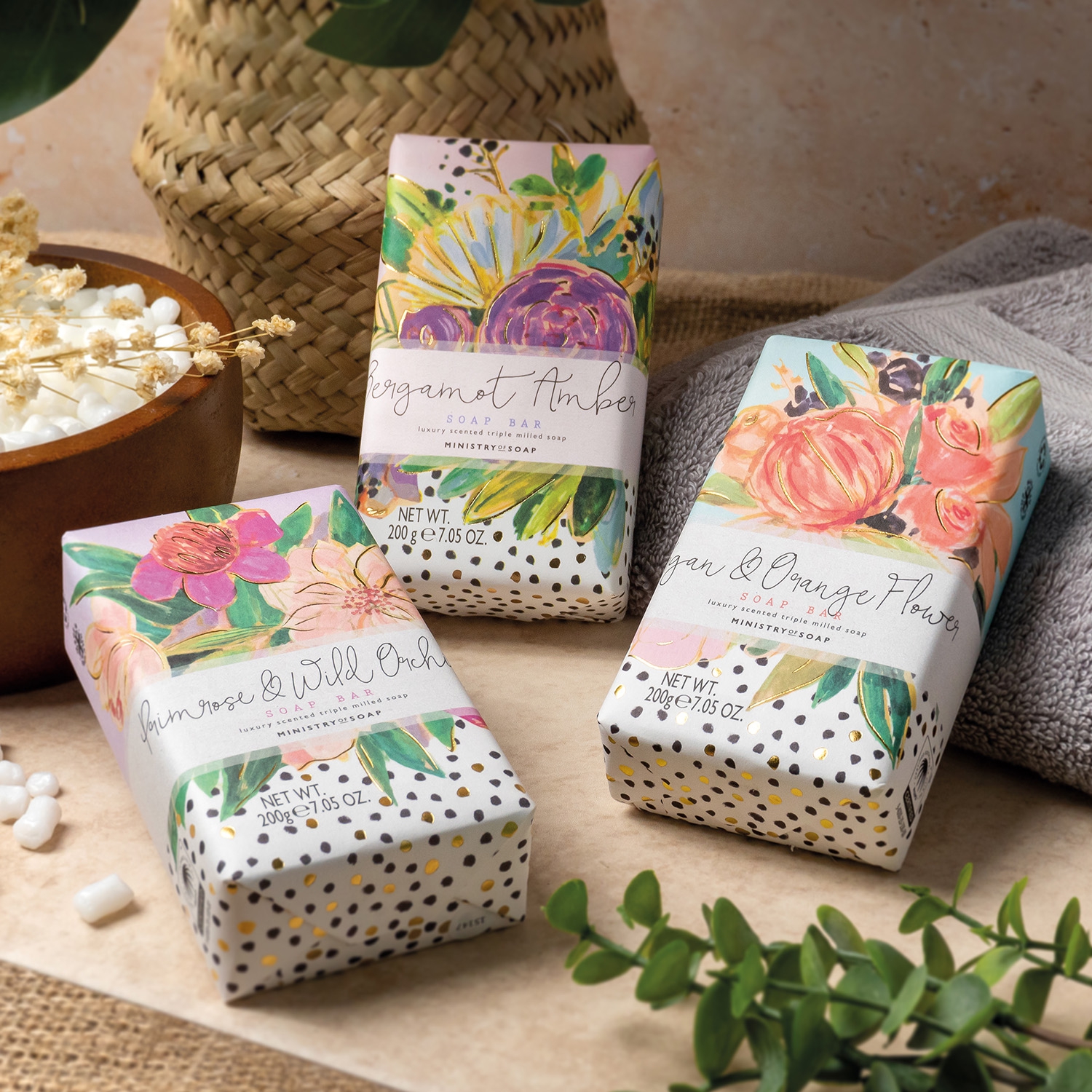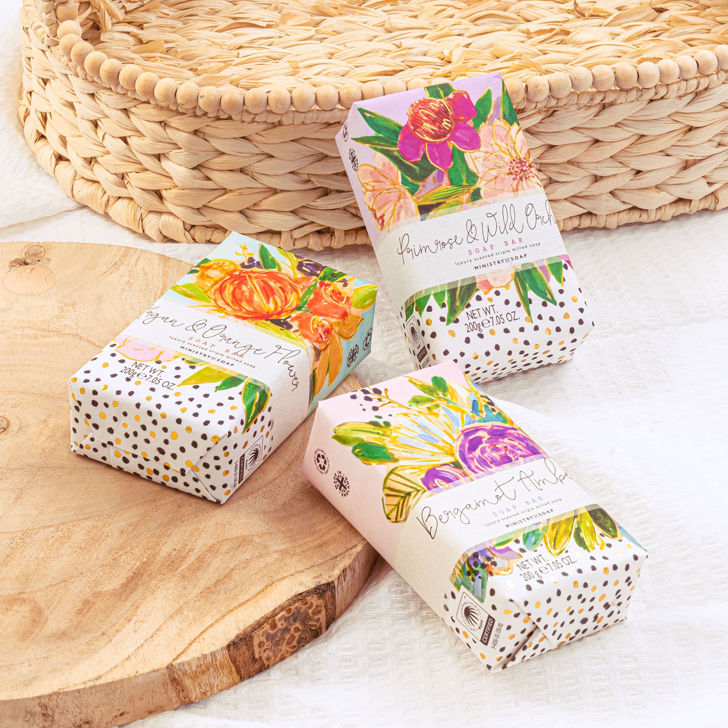 Die wunderschön verpackten Waschstücke enthalten ätherische Öle und werden dreifach gewalzt, was die Seifen besonders ergiebig macht.
