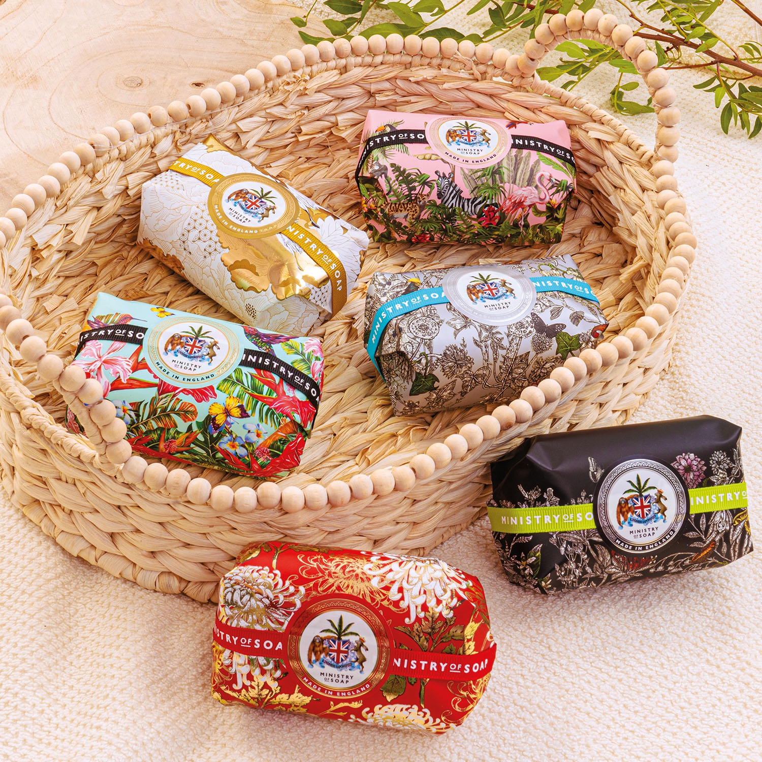 Die wunderschön verpackten Waschstücke enthalten ätherische Öle und werden dreifach gewalzt, was die Seifen besonders ergiebig macht.