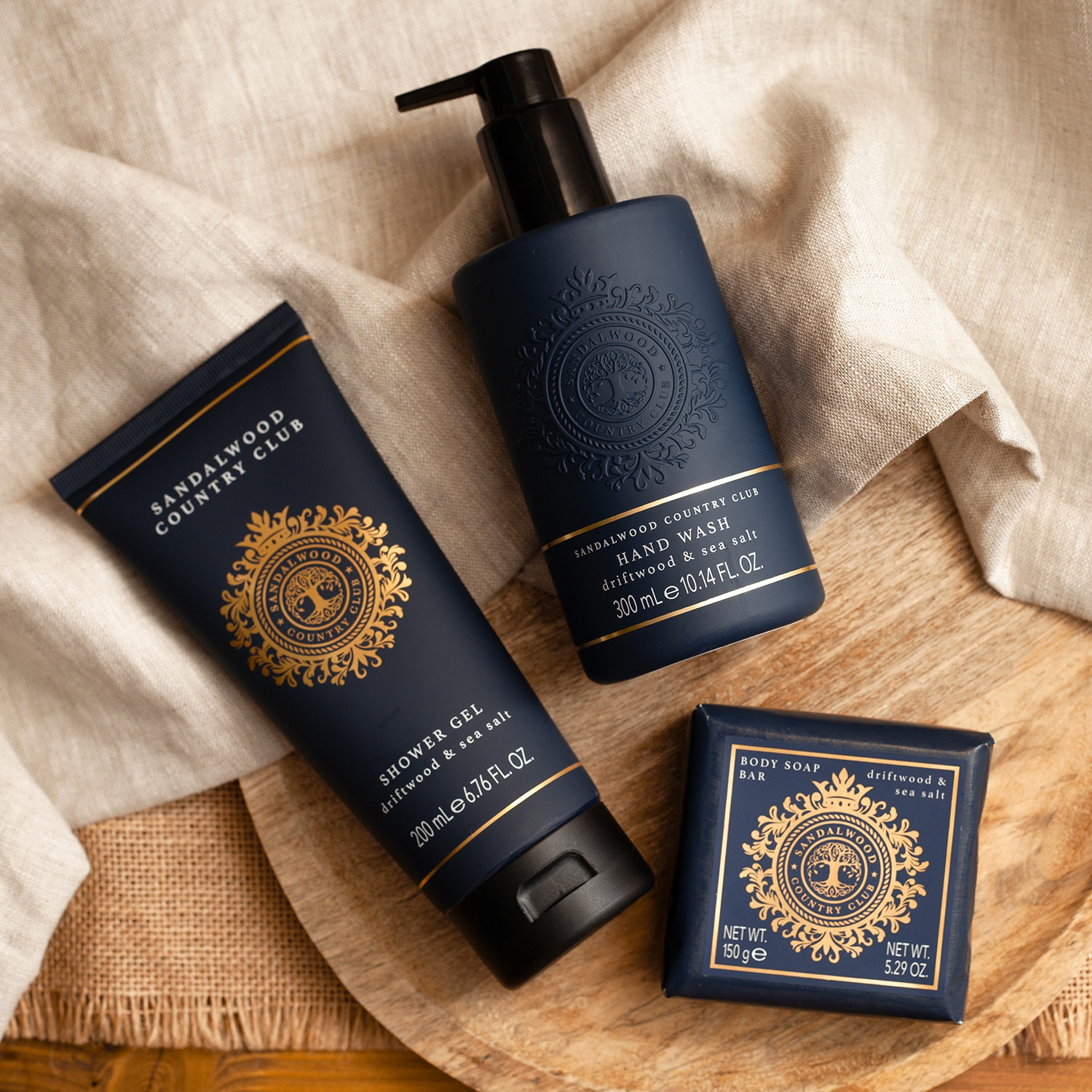 Inspiriert durch den vielfältigen Basisduft von Sandelholz, ist Sandalwood Country Club eine luxuriöse Unisex-Duft- und Körperpflege-Serie. Raffinierte Noten, die aromatisch-erdige und holzig-warme Düfte mit frischem Grün kombinieren, sorgen für Outdoor-Momente zuhause.