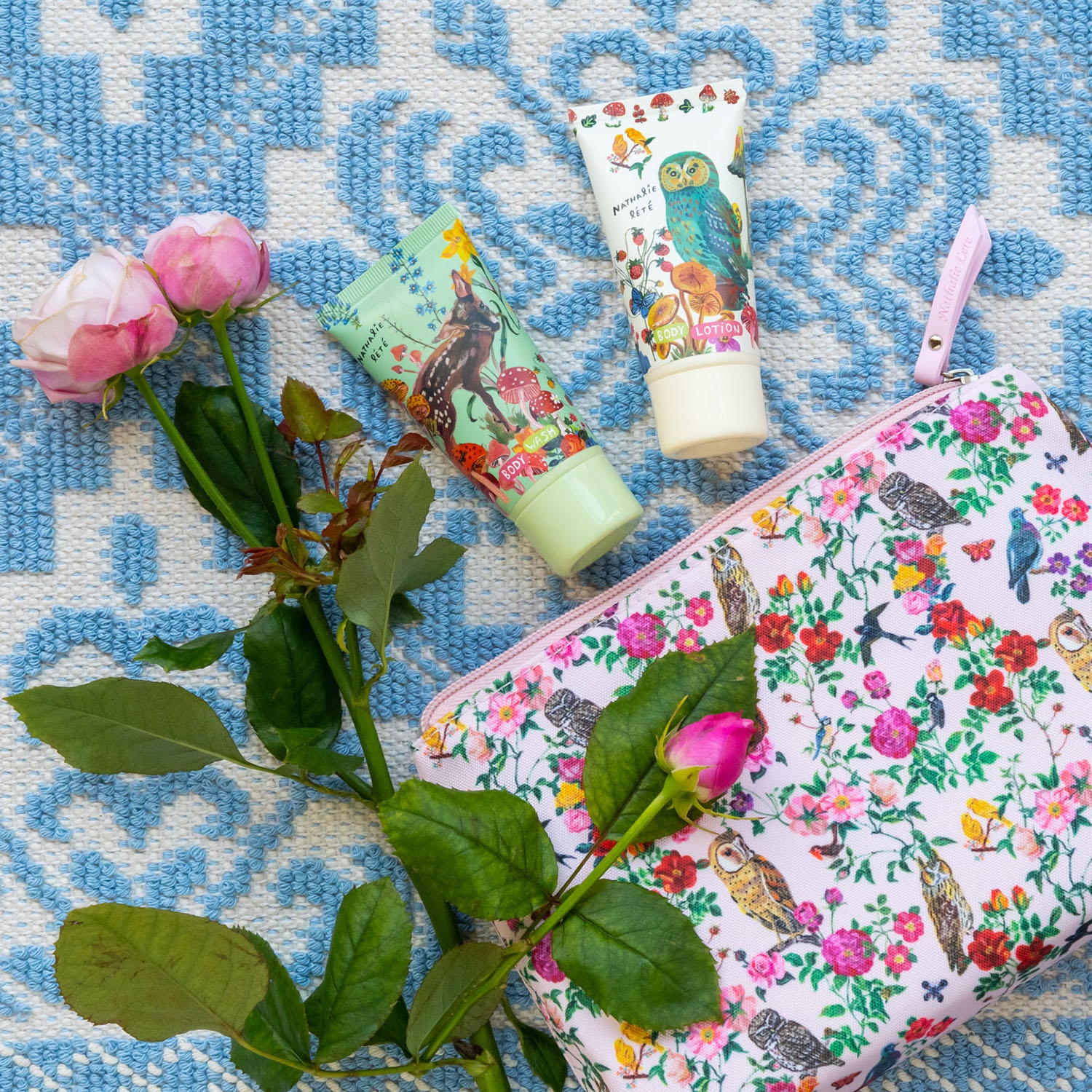 Die kleine Kosmetiktasche ziert ein wunderbar blumiger und tierischer Aufdruck. Außerdem beinhaltet sie ein mildes 50 ml Duschgel und eine 50 ml Körpercreme. Beide Produkte enthalten pflegende Inhaltsstoffe wie unter anderem Sheabutter und Vitamin E.