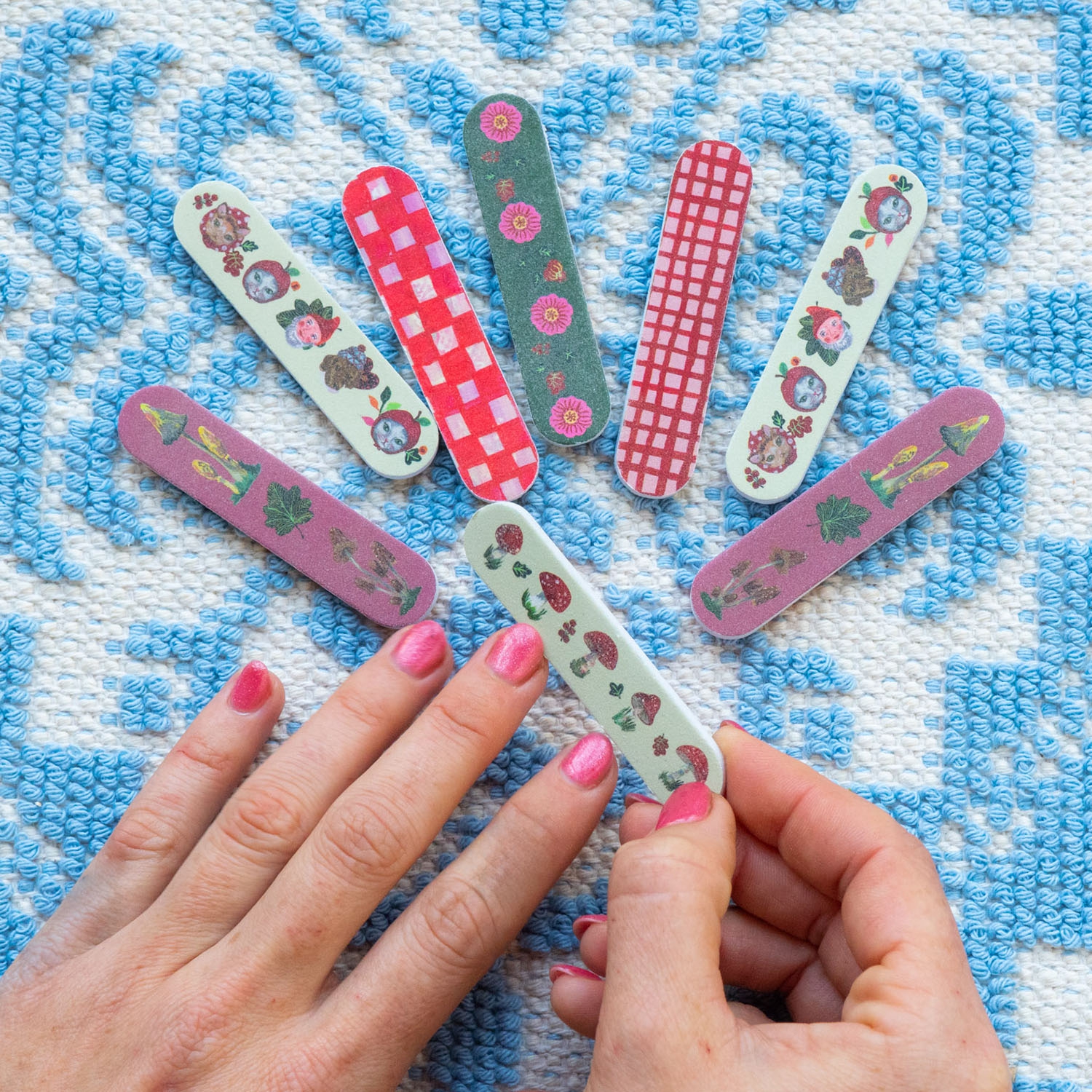 In der kleinen Schuberbox befinden sich insgesamt 8 kleine Nagelfeilen, die für eine schnelle Maniküre unterwegs sorgen. Bedruckt sind sie mit zauberhaften Motiven aus der Welt von Natalie Lete.