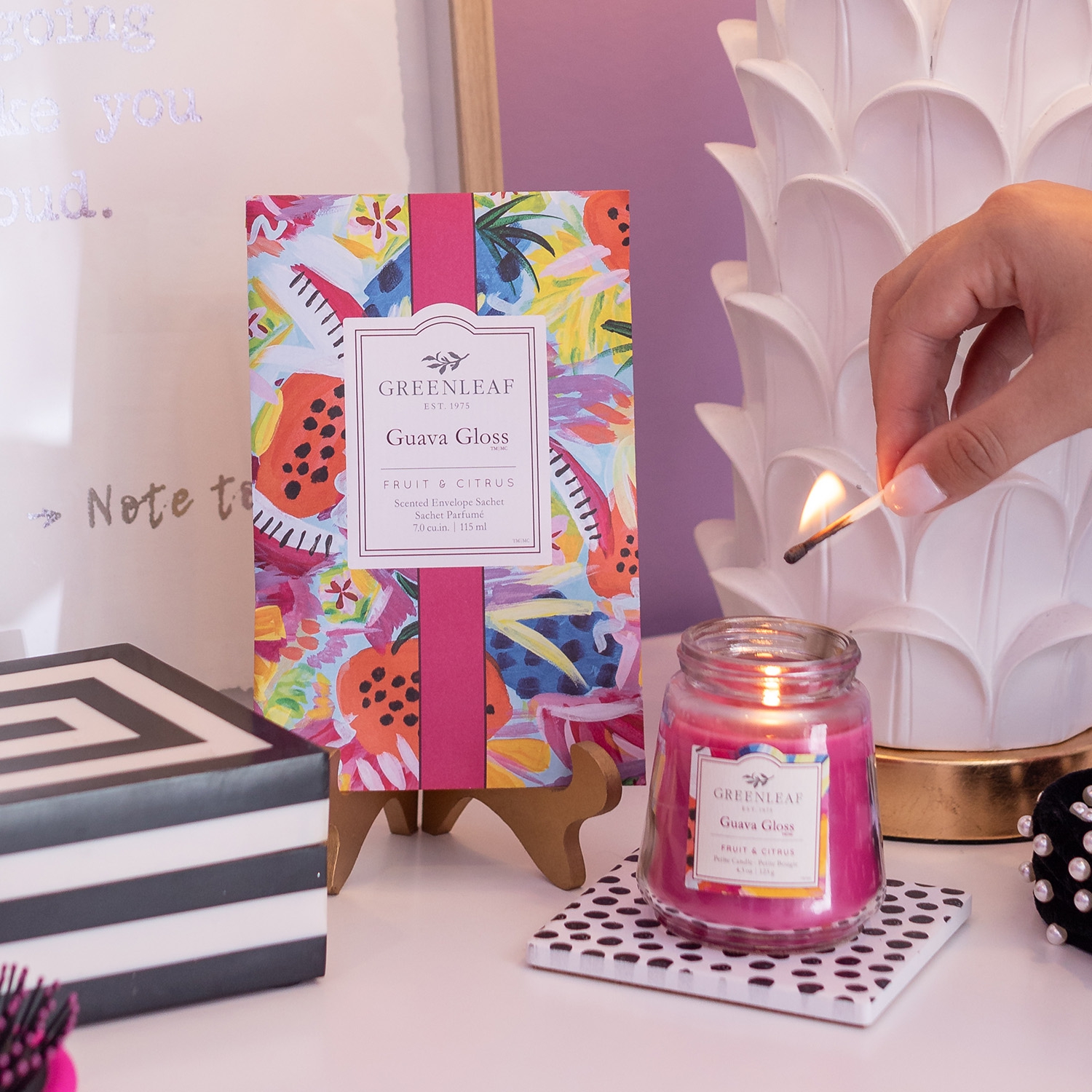 Guava Gloss ist ein strahlender, tropischer Duft mit Mandarine- und Grapefruitaromen in der Kopfnote. Im Mittelteil harmonieren die exotischen Noten von Guave und Passionsfrucht perfekt mit der Cremigkeit von Kokosnussmilch. Ein wunderbarer Duft für sonnige Urlaubserinnerungen und endlosen Sommerstunden.