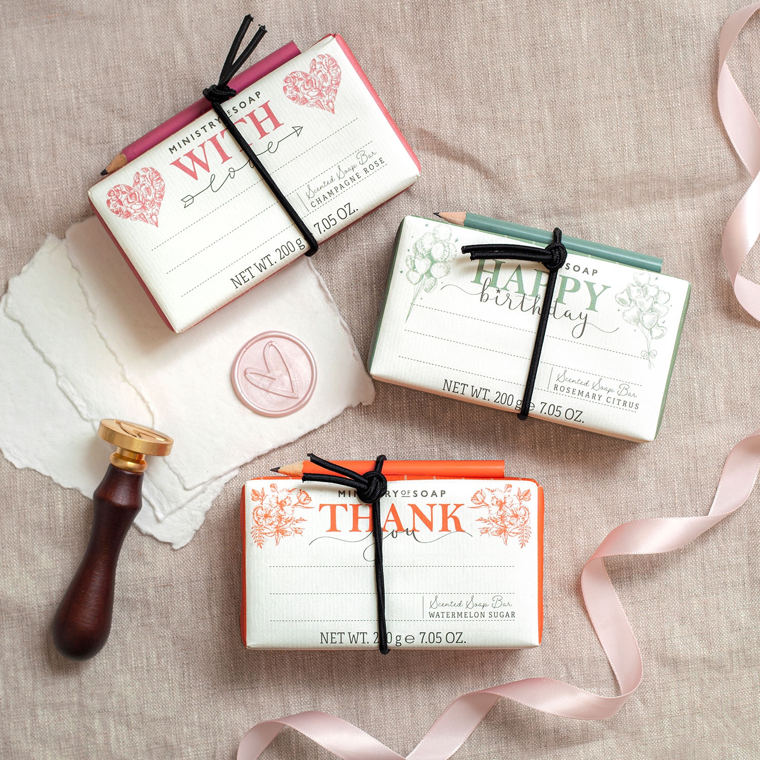Eine liebe Botschaft auf einem Stück Seife: das sind die Gift Note & Pencil Soaps von Ministry of Soap! Jede Seife kommt mit einem kleinen Bleistift, mit dem eine liebevolle Nachricht hinterlassen werden kann.