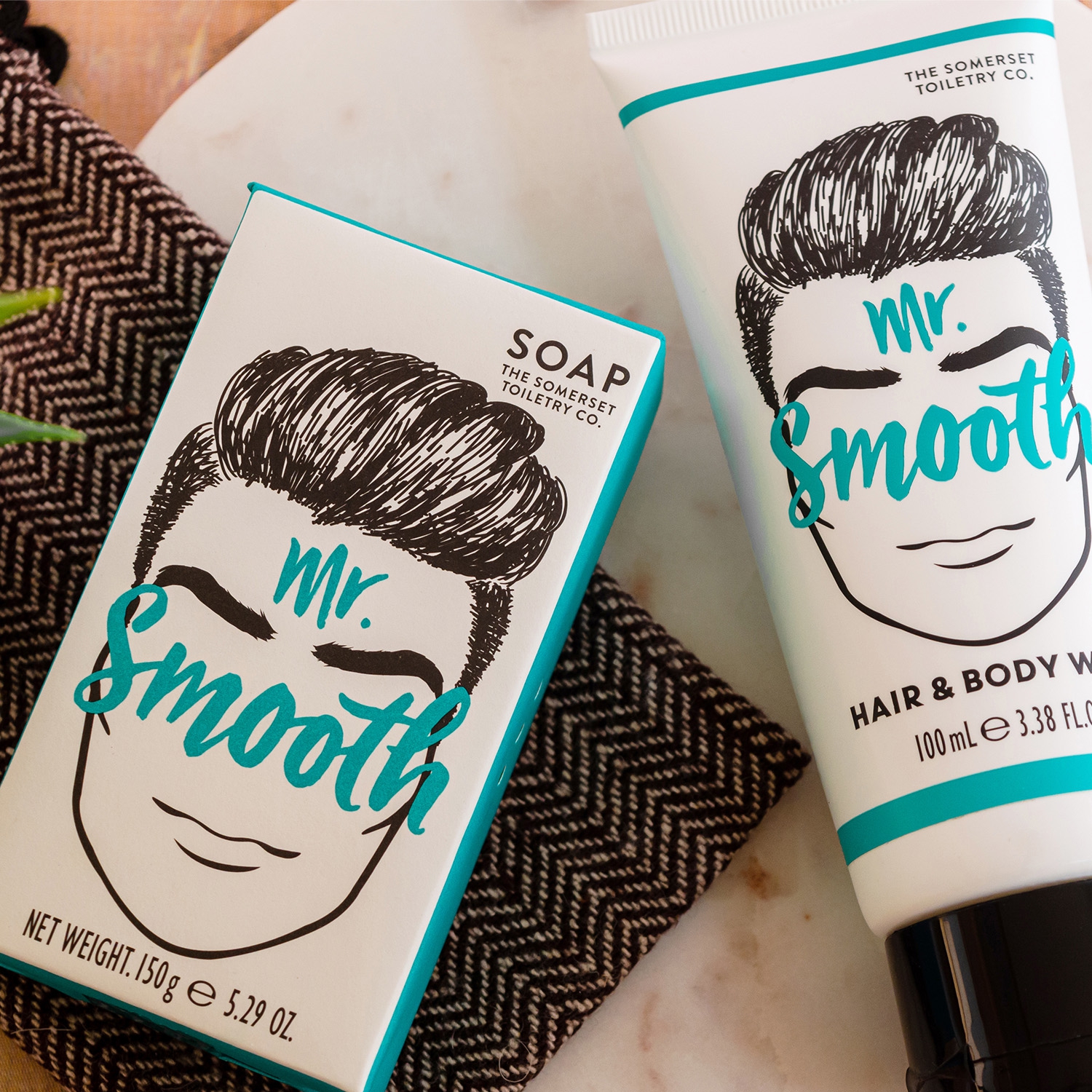 Das Mr. Smooth Geschenk Set besteht aus einem Seifenstück (150 g) und einem Hair & Body Wash (100 ml), beides verpackt in einer Plastik-freien Geschenkbox. Das perfekte Geschenk für echte Kerle.