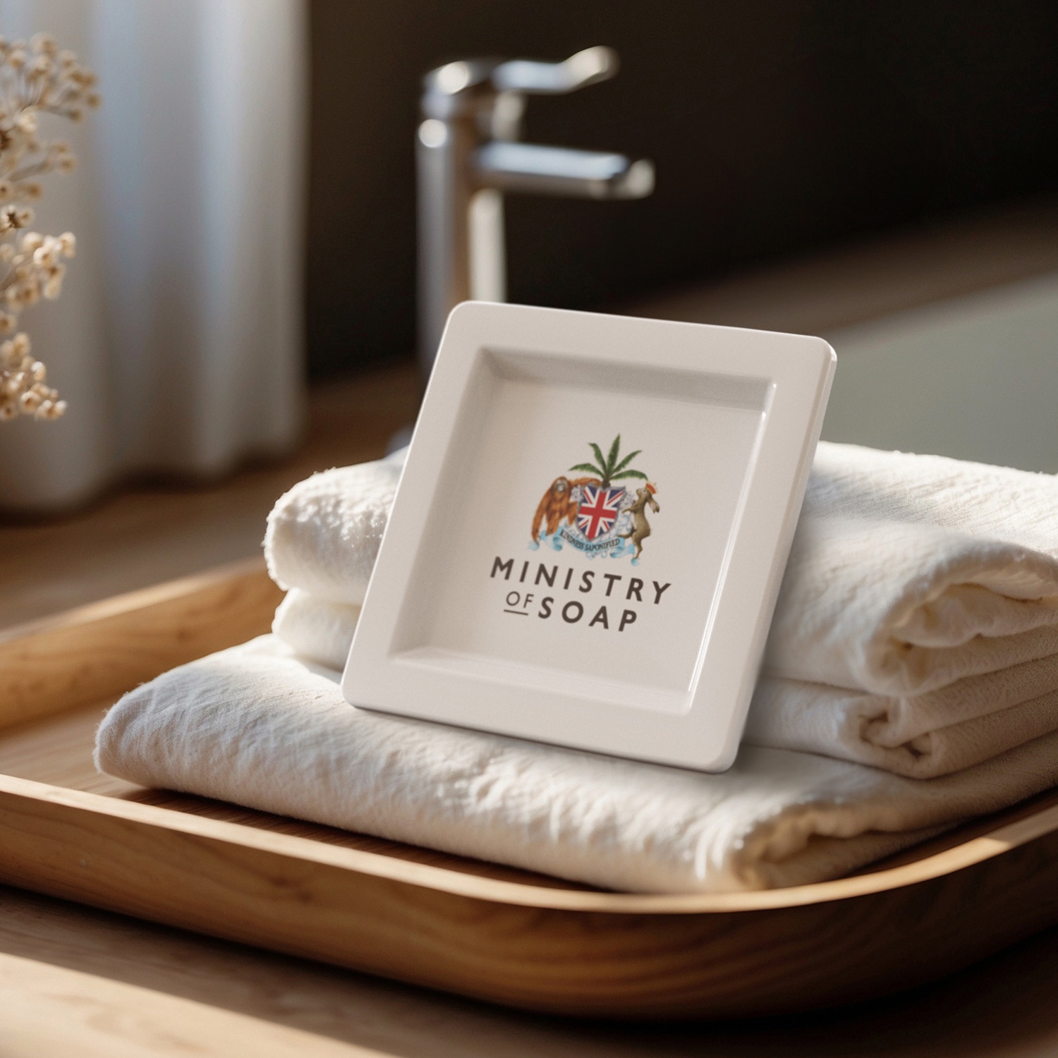 Die quadratische Seifenschale von Ministry of Soap hat die perfekte Größe für alle ebenso quadratischen 150 g Seifenstücke der Marke. Die Seifenschale ziert das witzige und verspielte Emblem von Ministry of Soap.