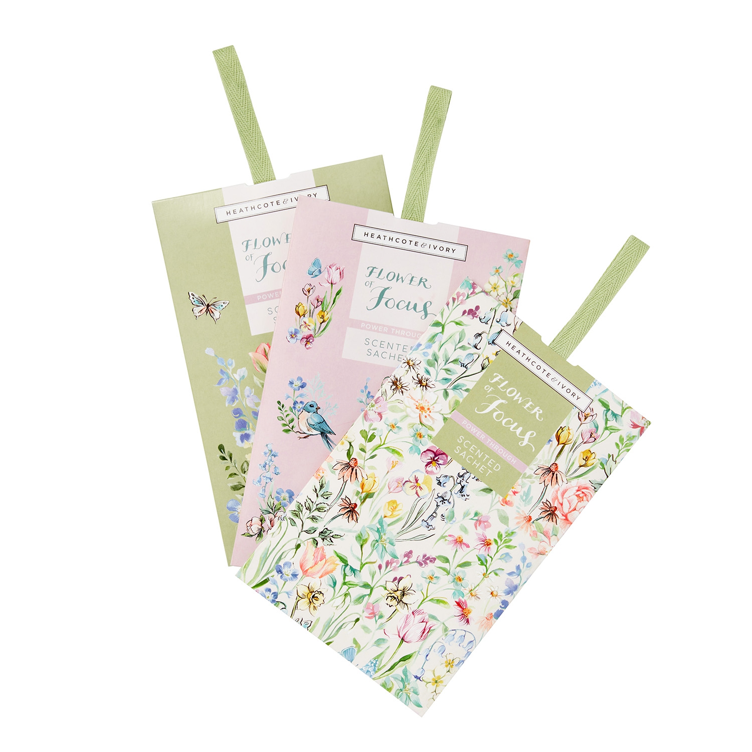 Drei farblich abgestimmte Duft Sachets mit Aufhängeschlaufen sind in einer dekorativen Box verpackt.