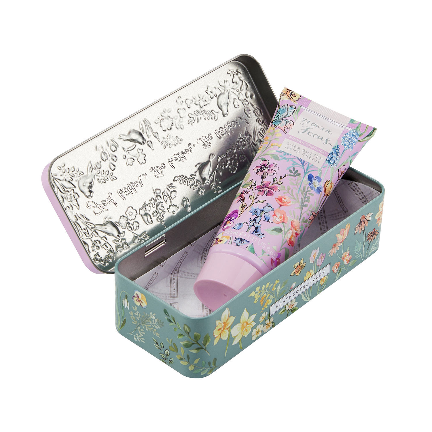 Die Handcreme mit 100 ml Inhalt liegt auf beduftetem Seidenpapier in einer geprägten Metalldose. Sie pflegt strapazierte Hände duftig-zart mit reichhaltiger Sheabutter und milder Kakaobutter.