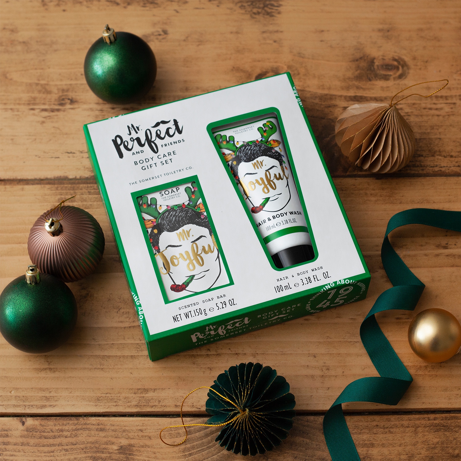 Das „MR. Joyful" Geschenkset bringt eine Menge „joy" ins weihnachtliche Badezimmer. Das perfekte Geschenk für Männer, die sich „nix" wünschen oder schon (fast) alles haben. Das Set besteht aus einer festen 150 g Seife und einem 100 ml Shampoo/Duschgel.