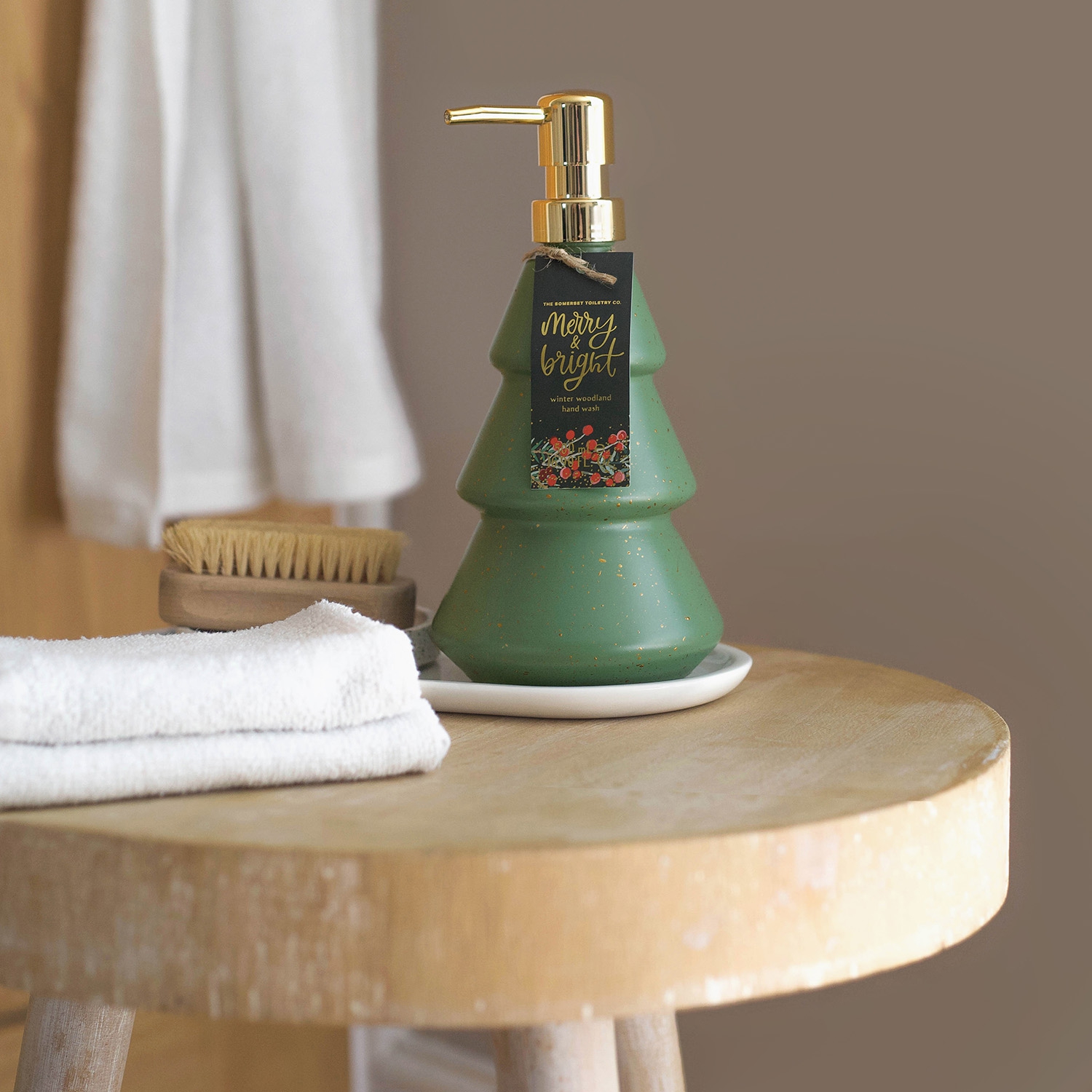 In klassischem Grün kommt „Merry Bright" daher und enthält warm-holzig duftende Flüssigseife.