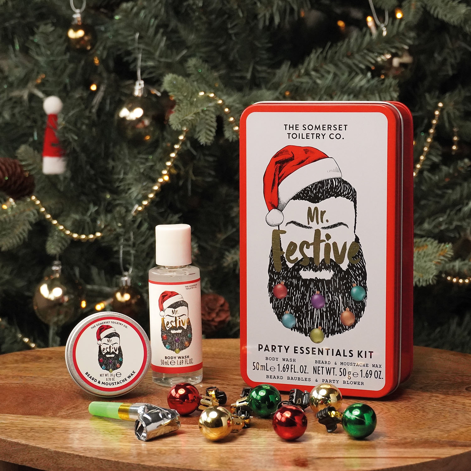 Ein witziges Weihnachtsgeschenk für humorvolle (bärtige) Männer: Die „Mr. Festive Gin Tin"! Die coole Metalldose enthält ein pflegendes Set bestehend aus 50 ml Duschgel und 20 g Pflegewachs für Bärte und Schnäuzer. Außerdem befinden sich in der Dose weitere witzige Gimmicks für den festlichen Weihnachts-Look: Kleine Deko-Kugeln, die sich als Schmuck im Bart befestigen lassen und eine Partytröte.