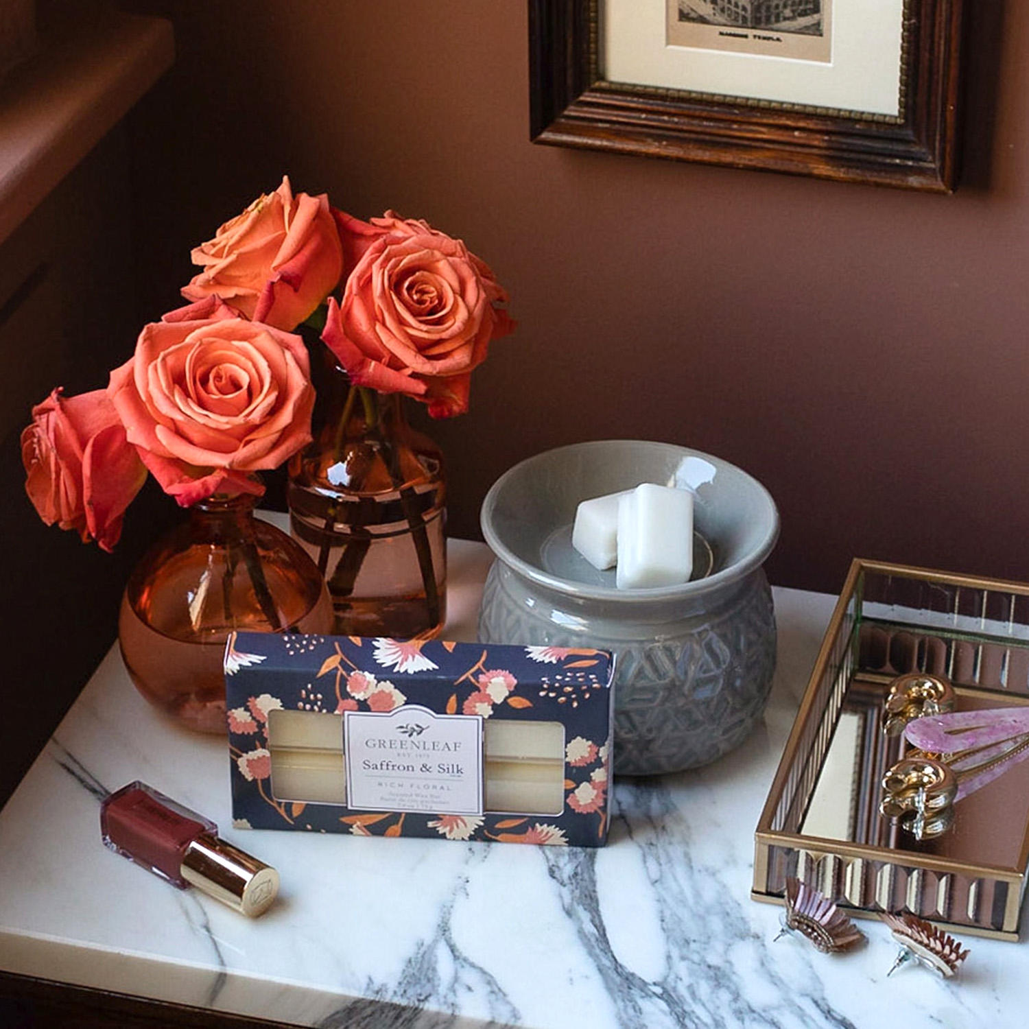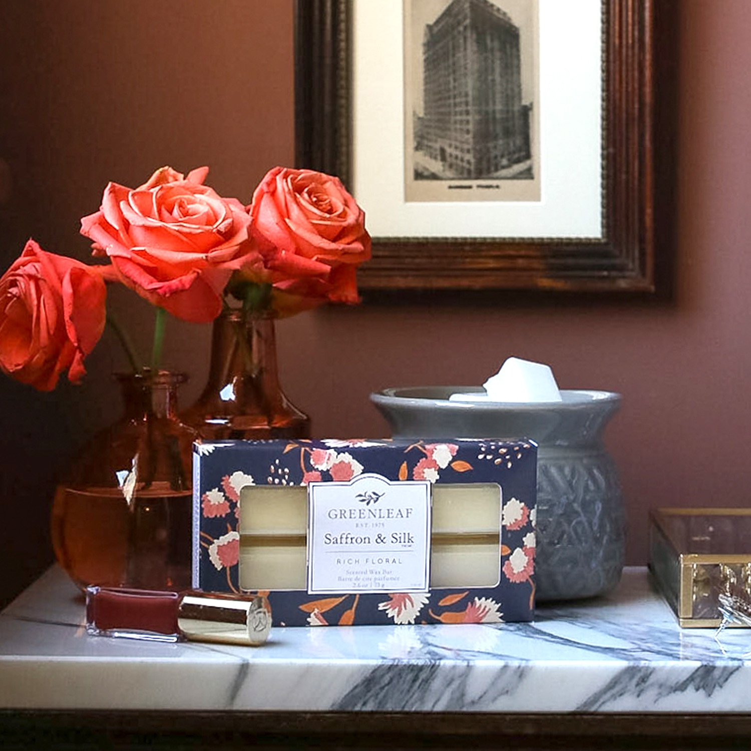 Saffron & Silk (Safran & Seide) ist ein opulenter, floraler Duft mit einem Hauch orientalischer Mystik. Arabischer Jasmin, cremig-weiße Gardenien und intensiver Rosenduft sorgen für blumige Intensität. Patchouli und Moschus in der Basis tragen erdige Wärme und Volumen bei.