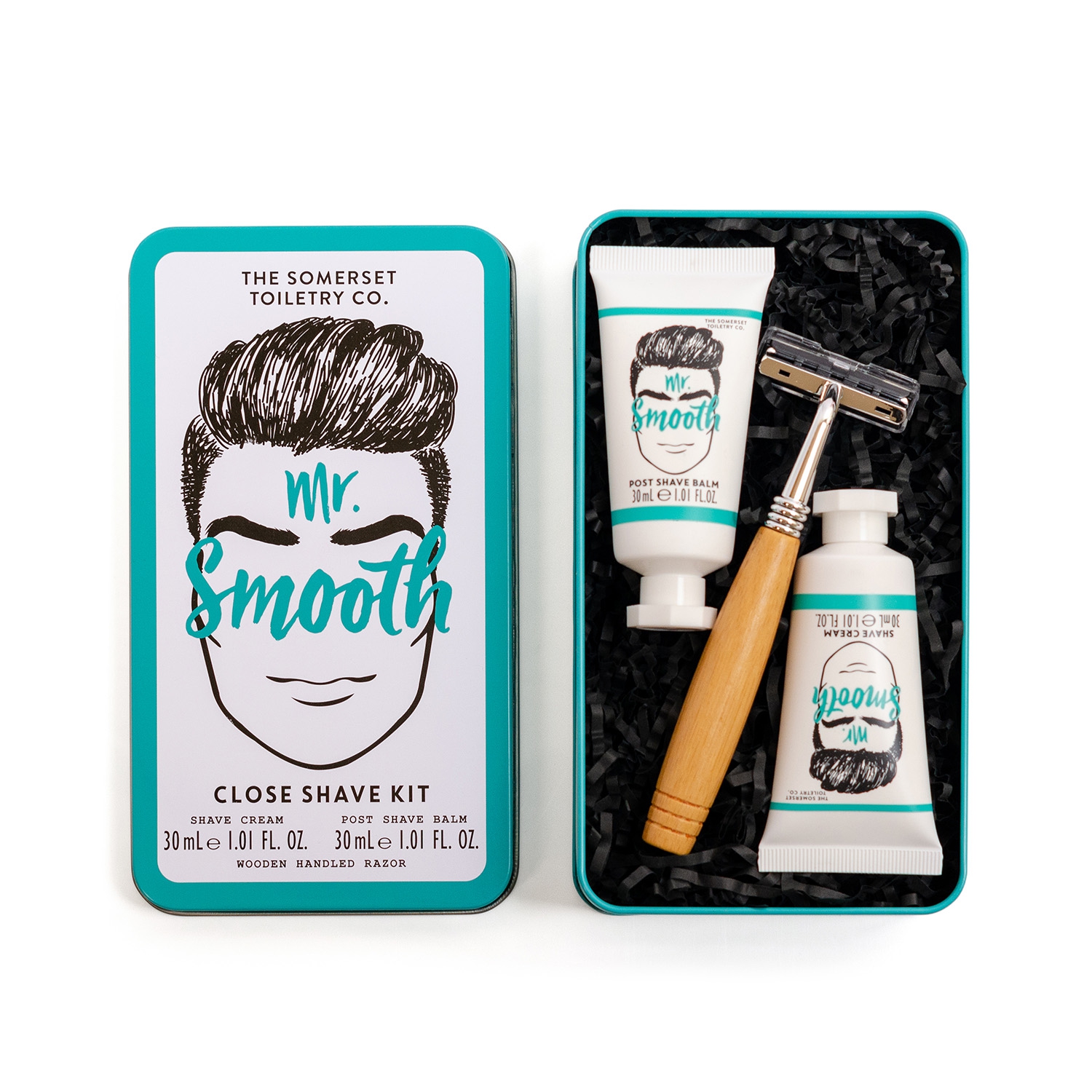 Das Rasierset von Mr. Smooth sorgt für glatte und `smoothe´ Haut nach der Rasur. Das Set enthält eine Tube mit 20 ml Rasiercreme, eine weitere mit 20 ml After Shave Balm und einen Rasierer mit Holzgriff für die Nassrasur.