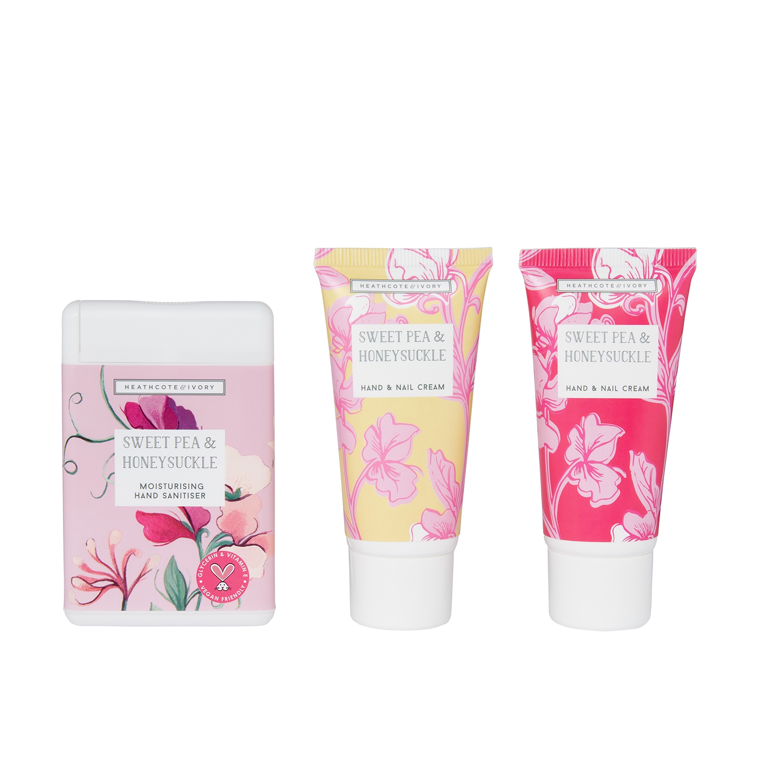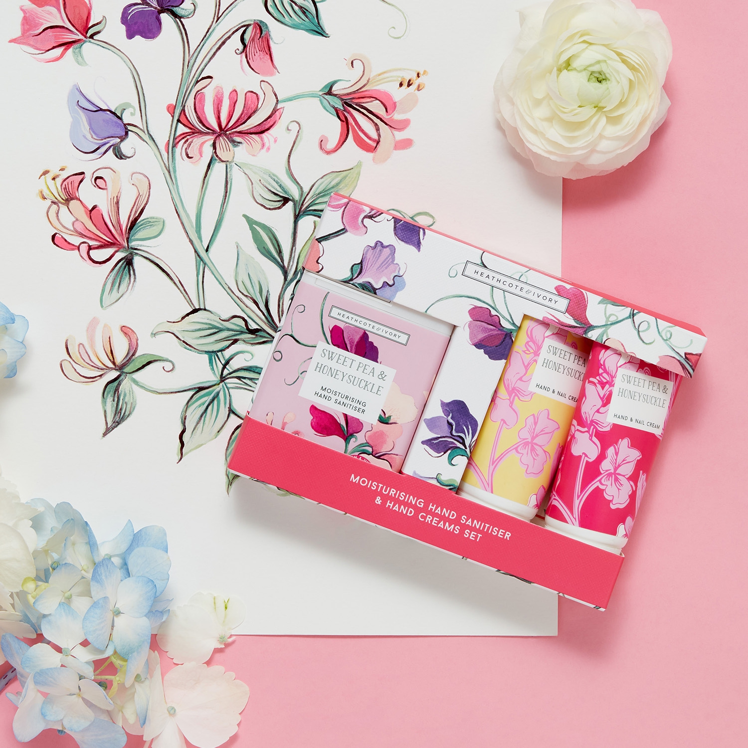 Duft und Design von Sweet Pea & Honeysuckle gehören zur Florals-Kollektion von Heathcote & Ivory. Üppige Blüten und zarte Ranken zieren die Verpackungen dieser Linie.
