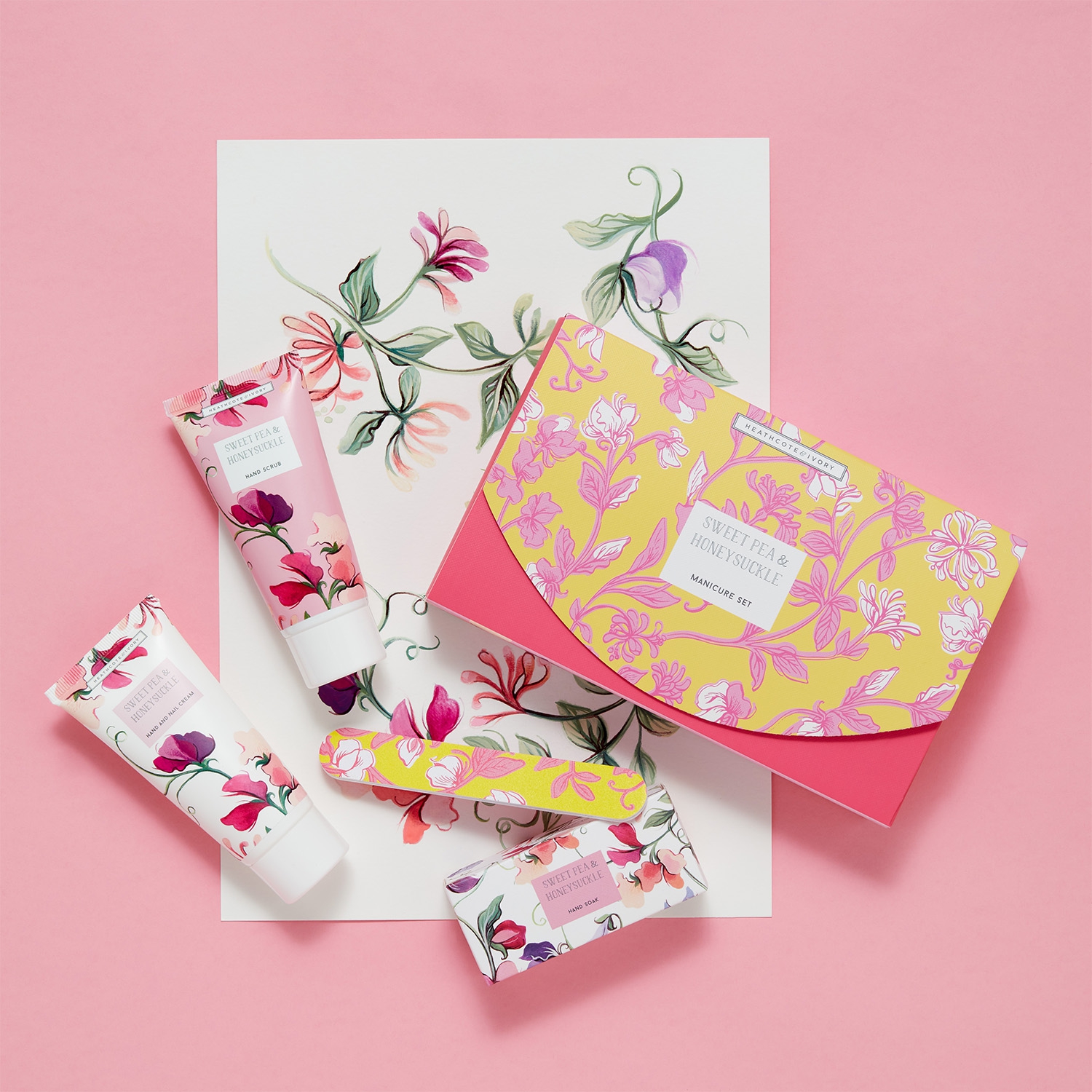 Duft und Design von Sweet Pea & Honeysuckle gehören zur Florals-Kollektion von Heathcote & Ivory. Üppige Blüten und zarte Ranken zieren die Verpackungen dieser Linie.